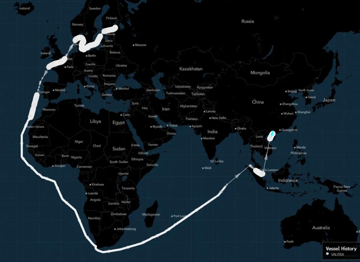 Танкер "Валера" с грузом СПГ с балтийского комплекса «Портовая» прибыл на импортный терминал Бэйхай на юге Китая