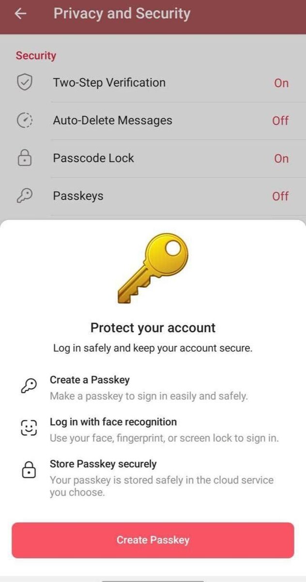 Telegram предлагает вход по ключам Passkey Теперь вместо SMS можно использовать отпечаток пальца, Face ID или PIN-код — ключ хранится только на устройстве и не требует паролей Passkey — это ключ доступа, который хранится в менеджерах паролей Чтобы активировать функцию, необходимо создать ключ и подтвердить личность, используя сканирование лица (Face ID), отпечатка пальца (Touch ID) или код-пароль Созданный ключ входа будет храниться на устройстве, что позволит входить в аккаунт, не прибегая к подтверждению через SMS Функцию можно активировать в разделе «Конфиденциальность» Telegram | Дзен | MAX