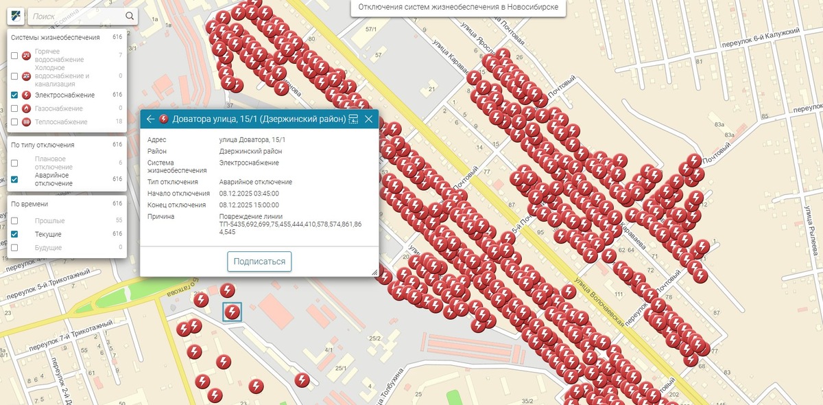 Крупная авария на электросети 8 декабря оставила без света 616 жилых домов в Дзержинском районе. Об этом свидетельствуют данные на муниципальном портале. Согласно карте отключений, большего всего пострадал частный сектор, где нет электричества на улицах Новороссийская, Юрия Смирнова, Караваева, Черенкова и других. Помимо этого, авария задела и несколько многоквартирных домов на улицах Доватора и Бориса Богаткова. Также многие жители жалуются на отсутствие горячего водоснабжения, так как газовые колонки не работают. Электричество отсутствует с 3:45. Изначально, согласно данным муниципального портала, устранить аварию должны были до 08:00, но на данный момент срок сдвинулся до 15:00. Ранее мы писали, что прокуратура организовала проверку после аварийного отключения тепла в Заельцовском районе. Андрей Лактионов
