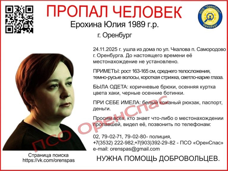 В Оренбургской области сотрудники полиции и волонтёры ПСО «ОренСпас» устанавливают местонахождение жительницы посёлка Самородово. Юлия Ерохина 1989 года рождения рождения 21 ноября 2025 года ушла из дома по улице Чкалова поселка Самородово и не вернулась. До настоящего времени её местонахождение не установлено. Приметы: рост 163-165 см, среднего телосложения, темно-русые волосы, короткая стрижка, светло-карие глаза. Была одета: коричневые брюки, осенняя куртка цвета хаки, черные осенние ботинки. При себе имела: белый кожаный рюкзак, паспорт, деньги. Всех, кто что-либо знает о местонахождении пропавшей или видел её, просия позвонить по телефонам:02, 79-02-71, 79-02-80 — полиция, +7(3532) 222-982,+7(903)392-29-82 — ПСО «ОренСпас».