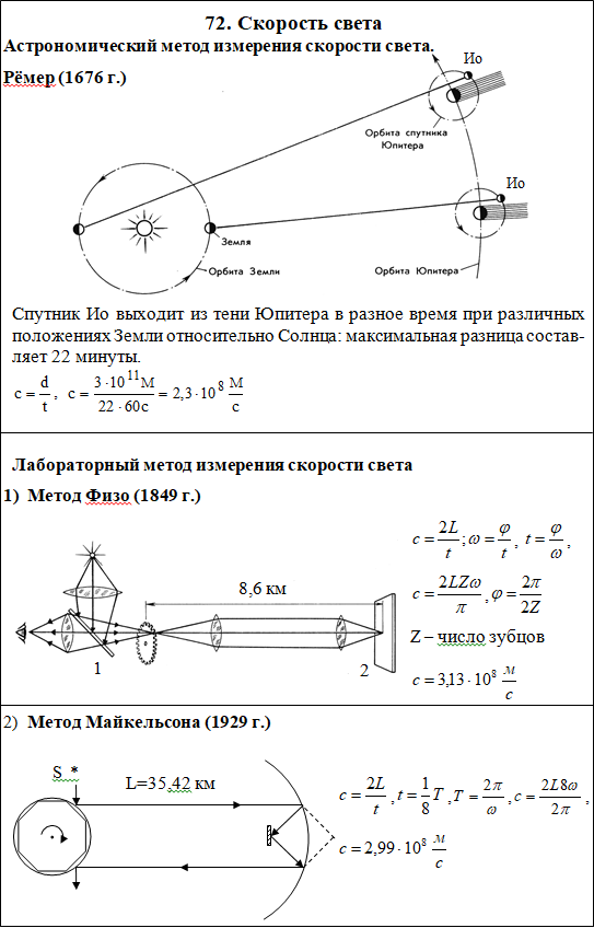 Описание конспекта «Скорость света» (с формулами) Конспект посвящён трём основным методам измерения скорости света: астрономическому методу Рёмера, лабораторному методу Физо и методу Майкельсона. Ниже приведено описание с основными формулами. 1. Астрономический метод Рёмера (1676 г.) Наблюдая выход спутника Ио из тени Юпитера, Рёмер установил разницу во времени наблюдений при различных положениях Земли, около 22 минут. Основная формула: c = ΔL / Δt, где ΔL — изменение расстояния до Юпитера, Δt — разница моментов наблюдений. Оценка Рёмера: c ≈ 2.3·10^8 м/с. 2. Лабораторный метод Физо (1849 г.) В установке используется вращающееся зубчатое колесо. Свет проходит к зеркалу и обратно. Основные формулы: t = φ / ω, c = 2L / t, φ = π / Z, где Z — число зубцов, ω — угловая скорость вращения, L — расстояние до зеркала. Итоговая формула: c = (2LωZ) / π. 3. Метод Майкельсона (1929 г.) Для измерения используется вращающийся многогранник. Основные формулы: t = 2L / c, ωt = 2π / N, где N — число гр
