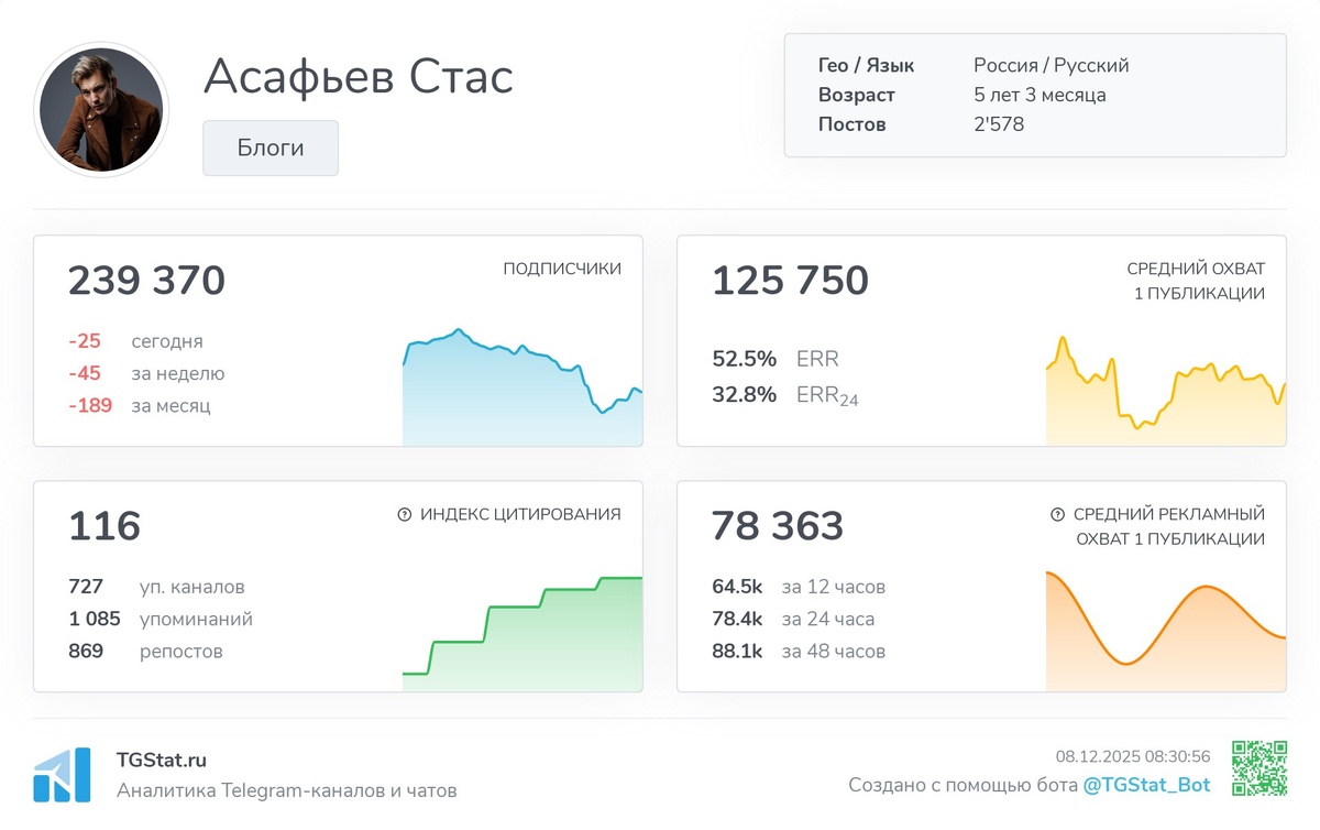 Продолжаем анализировать тг-каналы при помощи нейросети. Рассмотрим канал «Асафьев Стас» блогера и предпринимателя Стаса Асафьева.