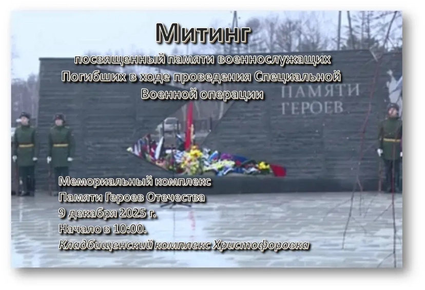 9 декабря 2025 года, в 10-00 на территории Мемориального комплекса памяти Героев Отечества (п. Христофоровка, кладбищенский комплекс № 3) состоится митинг, посвящённый памяти военнослужащих, погибших при исполнении воинского долга в ходе Специальной военной операции. Правительство Сахалинской области, совет РО Всероссийской организации ветеранов и региональный штаб Бессмертного полка Сахалинской области приглашает активистов ветеранских и молодежных патриотических организаций принять участие в митинге. Вспомним всех поименно! Горем вспомним своим! Это нужно - не мертвым! Это надо - живым!