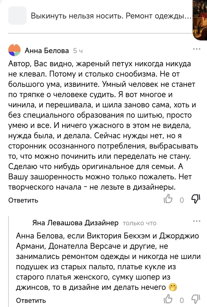 Можно только утилизировать в собственное жилище или переделывать и латать до дыр из экологических побуждений. Тогда ты настоящий дизайнер! Не стоит вообще покупать новые вещи, можно лет на 10 остановиться, если есть запас вещей из прошлого. Комментарий: А теперь про осуждение от тетеньки. Открывается Подборка, листаем до низа: И переделки были в юности, и мама перешивала в детстве на меня взрослые б/у вещи, и на заказ шила при профессии инженер и без з/п по полгода. Но когда голодные времена прошли, необходимость в этом отпала, у нее исчезло желание перешивать, а у меня носить подобные вещи. Сама переделывала в юности, но купленные вещи из магазина, новые, чтобы сделать их ярче, интереснее. Сама шить с нуля толком не умела, раскрашивала, расшивала бисером и бусинами, делала цветы из ткани и шила сумочки из старых джинсов. Но я человек, любящий менять образы, стили, ценю разнообразие. И, получив профессию, начала шить с нуля абсолютно всё, и одежду, и, домашний текстиль. Разбираясь