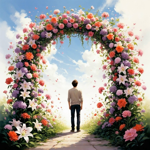 снится мне: Она стоит перед этой самой аркой. Цветы, знаешь, такие яркие, будто солнце в них заперли. Розы, лилии, орхидеи – всё, что только можно придумать, чтобы любовь показать. А запах! Боже, как пахнет! Сладко, но не приторно, словно лето собрало все свои ароматы и в эту арку положило.