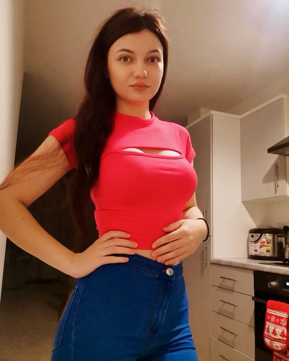 Ярко-красный топ, словно вспышка пламени, облегал фигуру, подчёркивая её стройность. Необычный вырез на одежде добавлял образу нотку дерзкой элегантности, будто приглашая разгадать её тайну. Синие джинсы, плотно сидящие на фигуре, напоминали глубокое небо перед закатом — сдержанные, но полные внутреннего сияния.