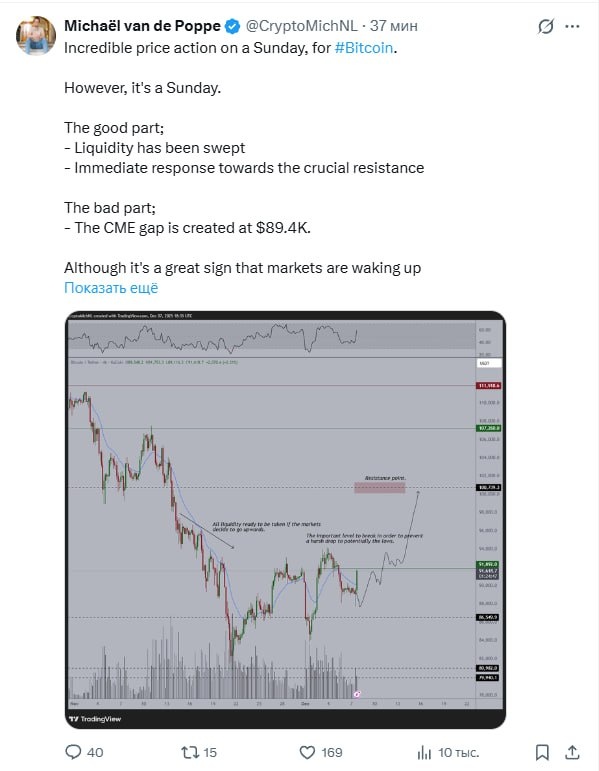 Невероятное движение цены биткоина для воскресенья. Однако, сегодня воскресенье. Хорошая сторона: Ликвидность была "выметена" Мгновенная реакция в сторону ключевого уровня сопротивления Плохая сторона: Образовался гэп (разрыв) на CME на уровне $89.4 тыс. Хотя это отличный знак, что рынки пробуждаются и мы видим такой импульс, я думаю, не будет лишним помнить о потенциальной коррекции для закрытия гэпа CME в понедельник/вторник. Помимо этого, давайте пройдём эту зону сопротивления и возьмём $100 тыс. Настроения изменятся, когда эти движения произойдут.