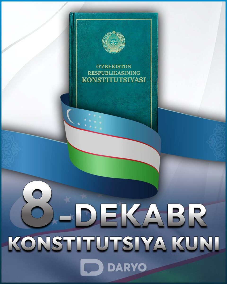 📘 8-dekabr – O‘zbekiston Respublikasi Konstitutsiyasi kuni Konstitutsiya — davlatimizning asosiy hujjati, jamiyat taraqqiyoti va fuqarolarning fundamental huquqlarini kafolatlovchi bosh qonun. Unda adolat, tenglik va qonun ustuvorligi tamoyillari mustahkam belgilangan. “Daryo” jamoasi barchani Konstitutsiya kuni bilan tabriklaydi. Yurtimizda qonun ustuvorligi, tinchlik va barqarorlik doimo mustahkam bo‘lishini tilaymiz. @daryolive