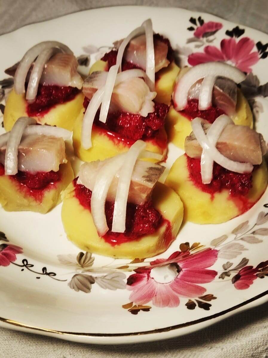 Отварить картофель в мундире , свеклу запечь в духовке. Можно свеклу сварить , но запечённая в духовке - она вкуснее. Дать остыть. Картофель нарезать оладушками, свеклу натереть на терке ( я натерла на мелкой терке, но думаю что лучше будет, если натереть на крупной терке, так она меньше сока даст). Свеклу смешать с майонезом и посолить. Лук очистить , нарезать тонкими полукольцами. Положить лук в миску и влить в него уксус , воды так , чтобы она полностью накрыла лук. Туда же в лук насыпать сахар : все перемешать и поставить мариноваться 30 мин. На картофель положить свекольное пюре, сверху наложить кусочки селедки и украсить маринованным луком. Сразу подавать на стол. Что нужно: 2 филе малосольной селедки 1 свекла