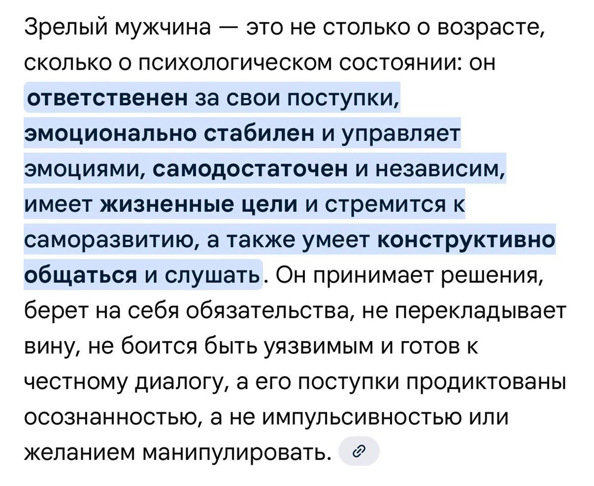 качество ЗРЕЛОСТЬ закрывает многие вопросы, которые могут возникать у женщин при выборе партнера поэтому для меня оно становится сейчас КЛЮЧЕВЫМ 🙏🏻 Сегодня переспала со всеми мыслями, трансформациями, разделениями, отпусканием, выходом из программ, перенесла фокус на зрелость в мужчине и стало легче ⚡️ток стал меньше, пока еще есть в той ситуации, но он стал намного меньше «Я просто выбор тогда не сделала окончательный, я не признавала своего мужа, я всё время хотела его поменять. Я всё время была в напряжении, что очень негативно сказывалось на моей семье» ————- Однажды я решила, что больше не буду гордиться собой, когда у меня трудная жизнь, я сталкиваюсь со сложностями и прохожу их для повышения собственной ценности Я вышла из ⬆️ такой уничтожающей программы в другую ⬇️ Я ГОРЖУСЬ СОБОЙ КОГДА ВСЁ СКЛАДЫВАЕТСЯ ЛЕГКО ВЕДЬ ЭТО ЛЕГКО СОЗДАЛА Я САМА так пусть и в теме отношений всё будет сейчас для меня легко Я просто легко встречаю зрелого мужчину, рядом с которым хочется быт