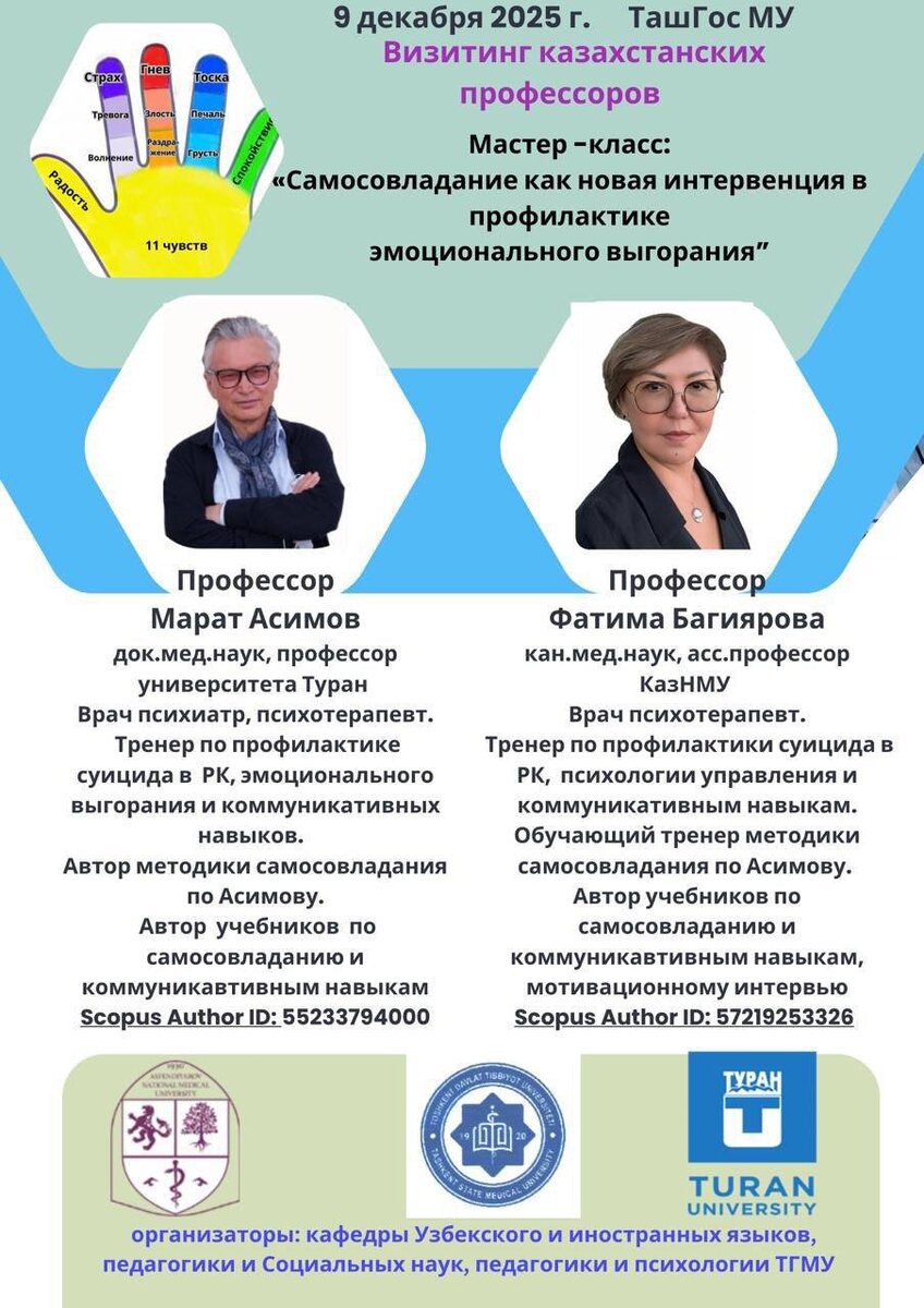 🇺🇿🤝🇰🇿 Кафедры “Узбекского и иностранных языков, педагогики” и “Социальных наук, педагогики и психологии” ТашГосМУ приглашают на Мастер -класс: «Самосовладание как новая интервенция в профилактике эмоционального выгорания». В рамках академической мобильности: КазНМУ им С. Д. Асфендиярова и университет «Туран», Казахстан. 📅 Дата и время: 9 декабря, 2025 года 🕚 08.30-11:00 (малый зал, 2-кампус. 12.00-15.00 (3 -кампус, морф корпус 417 кабинет). ✅Rasmiy sahifalarimiz: Telegram | Facebook | Instagram | YouTube | X | LinkedIn