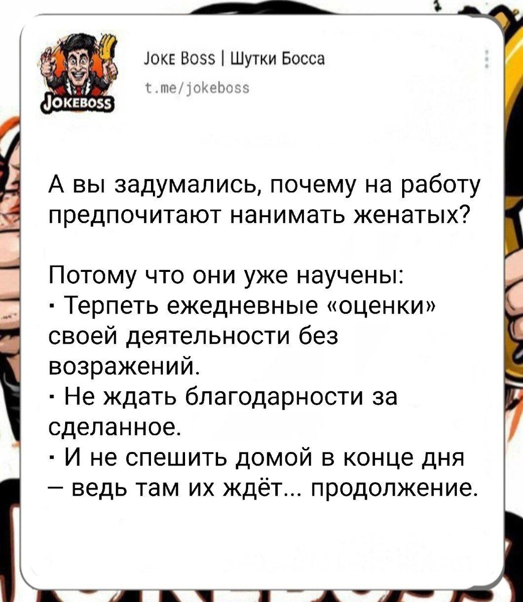 Женатый сотрудник — это готовый продукт адаптации к стрессу. Понедельник для него не шок, а просто ещё один день из цикла «привыкнуть и выжить». P.S. Если такой сотрудник вдруг задерживается на работе допоздна — возможно, он просто медитирует над вопросом: «Где здесь больше тишины?» 🤫🏠💼 #ЖенатыйНаРаботе #ТерпениеКакНавык #ОфисИлиДомОдинАд #ПонедельникДляСильных #понедельник #юмор #шутки #joke #jokeboss #шуткибосса