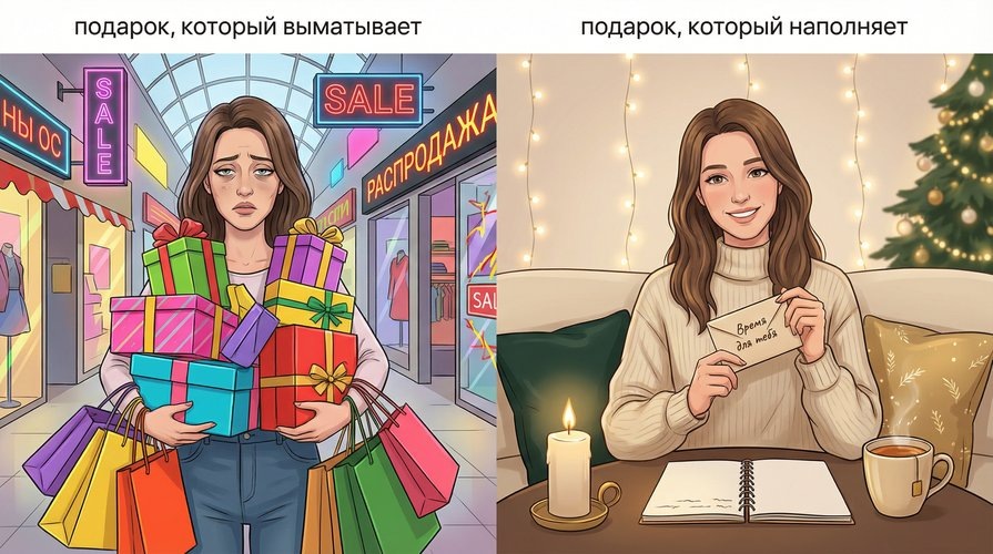 В итоге ты носишься по ТЦ, заказываешь «что‑нибудь подороже», а 31‑го чувствуешь не радость, а опустошение и дырку в бюджете.
