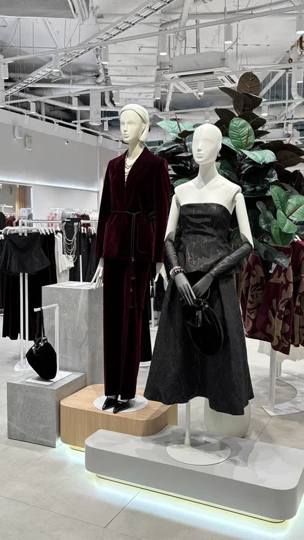 По уже знакомой вам традиции мы вновь отправились в ТЦ — на этот раз инспектировали магазины на предмет нарядных капсул для встречи Нового года. Этой статьёй открываем целую серию материалов — показываем, что есть в магазинах, что брать, а что не стоит и что с чем стилизовать. Небольшая ремарка: обзоры наши никем не оплачиваются, из рекламы здесь только сумки Toscanabags, которые мы привезли с собой, поэтому смело можем говорить правду — а это всегда приятно! Поехали! Zarina в этом сезоне старается и штампует коллекции одна за одной — каждые пару недель выходят новинки. На входе нас встречает костюм из бархата — неплохой внешне, но вот пояс-шнурок уже поистрепался, надо заменить, что обидно, ведь стоит костюм далеко не 3 копейки. Понравилась и пара из ткани "под мрамор" — топ с модной в этом сезоне баской и юбка А-силуэта. Самое главное, чтобы узор костюма не совпал с расцветкой плитки на полу, в ванной или на фартуке — получится смешно. Melon fashion group, к которой
