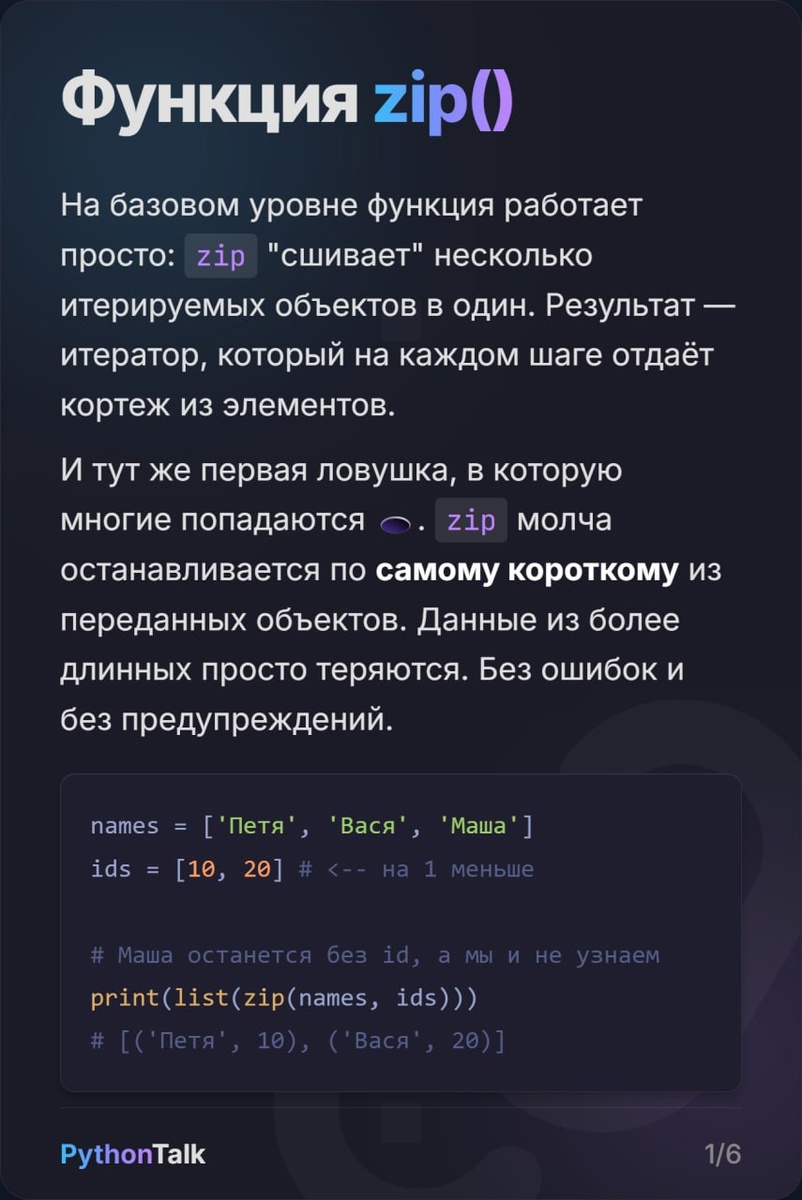 Функция zip() в Python 🤐 Все знают zip() и то, что эта функция обрезает результат по самому короткому списку. Но все ли знают, что в Python 3.10 завезли параметр strict=True? Если длины итерируемых объектов не совпадут, zip больше не будет молчать, а кинет ValueError. И это лишь один из нюансов. Как zip работает под капотом, чем его заменить, если потеря данных недопустима, и как провернуть трюк с "раззиповкой" — разобрал всё в карточках, листайте. 📑 #анатомия_питона