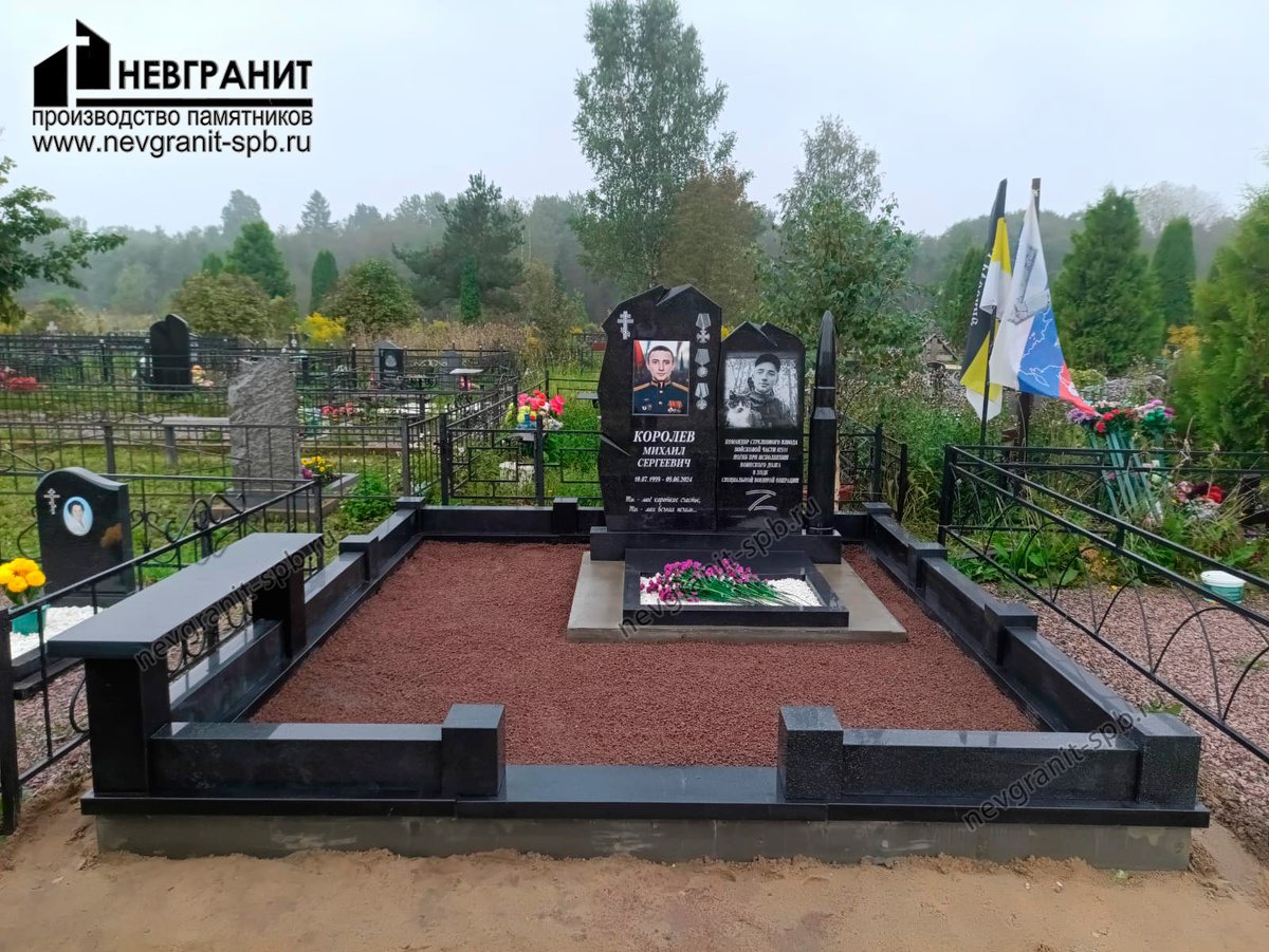 На представленном изображении мы видим образец мемориального комплекса, выполненного с особым вниманием к деталям, подчеркивающим служебный долг и память о людях, отдавших жизнь за Родину. Этот памятник, судя по оформлению и символике, посвящен военнослужащим, и выполнен в строгом, но глубоко символичном стиле. Материалы и Оформление Участка: Основной материал комплекса – черный гранит Габбро-диабаз, который символизирует вечность, скорбь и непоколебимость. Участок огражден невысоким, но массивным ограждением из того же черного полированного гранита, что придает захоронению законченный и строгий вид. Внутреннее пространство участка засыпано декоративной крошкой красно-коричневого цвета, создающей контрастный, теплый акцент на фоне черного камня. Центральная Композиция – Стелла: Стелла представляет собой композицию из двух вертикальных плит, объединенных общим стилем и основанием, что часто используется для увековечивания памяти двух близких людей или для выделения ключевых аспектов