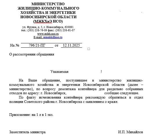 Почти детективная история 18+ НАСТОЯЩИЙ МАТЕРИАЛ (ИНФОРМАЦИЯ) ПРОИЗВЕДЁН, РАСПРОСТРАНЕН И (ИЛИ) НАПРАВЛЕН ИНОСТРАННЫМ АГЕНТОМ КАВЕРЗИНОЙ СВЕТЛАНОЙ ВИКТОРОВНОЙ ЛИБО КАСАЕТСЯ ДЕЯТЕЛЬНОСТИ ИНОСТРАННОГО АГЕНТА КАВЕРЗИНОЙ СВЕТЛАНЫ ВИКТОРОВНЫ* * номер в списке Минюста 777 В ИЮЛЕ в одном из дворов Советского района исчез контейнер для раздельно собранных отходов С июля жители пытались разобраться : куда же делся контейнер? Мусорный регоператор САХ и управляющая компания Академия комфорта показывали пальцем друг на друга И вот в НОЯБРЕ пришло такое письмо: обратитесь в полицию Замечательно же?)