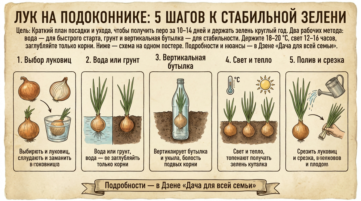 Вода — быстрый старт, идеальна для первой волны зелени за 10–14 дней. Грунт — стабильность и простое обслуживание, лучший вариант для кухни круглый год. Вертикальная бутылка — максимум пера на минимум места, при условии поворота и аккуратного полива. Свет 12–16 часов и 18–20 °C — базовые условия. Никакая хитрость не заменит света и тепла.