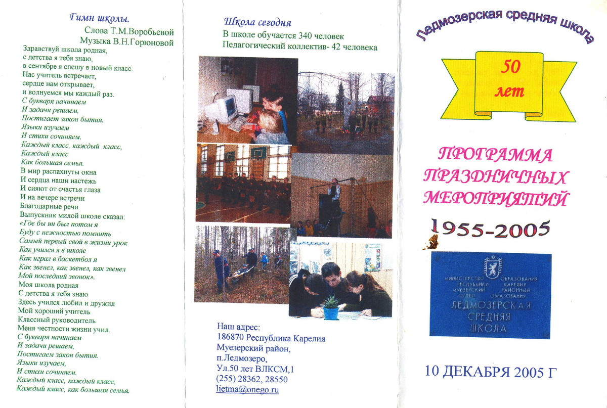 Выступления учащихся и их родителей, воспоминания выпускников и бывших учителей, цветы и подарки, награждения грамотами министерства образования и по делам молодёжи Республики Карелия за многолетний и добросовестный труд в Ледмозерской средней школе, которые вручала начальник районного отдела образования Татьяна Вяйновна ТУПИНА.