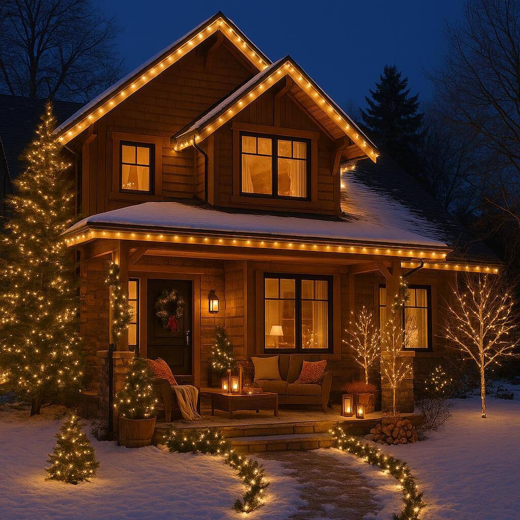 Как украсить частный дом к Новому году? Новый год — идеальный повод подчеркнуть архитектуру дома и атмосферу участка. Делимся идеями, которые подойдут именно для частного дома. 1. Подсветка фасада и свесов кровли Гирлянды по контуру крыши, теплый белый свет — самое выигрышное решение. Подчеркивает архитектуру дома, особенно если у вас широкие свесы, панорамные окна или сложная форма фасада. 2. Украшение входной группы Что можно использовать: • хвойные композиции по перилам, • светящиеся деревья по краям крыльца, • фонари у входа, • декоративные дрова у двери — идеально для загородного дома. Вход становится по-настоящему праздничным. 3. Терраса как зимняя гостиная Если есть терраса — её обязательно стоит оформить. Подойдут: • теплые пледы, • декоративные подушки, • фонари и свечи в защищенных колбах, • мини-ёлки в кадках. Такой декор не только красивый — он делает пространство уютным даже зимой. 4. Участок тоже можно подсветить В частном доме есть то, чего нет в квартире — ландшафт