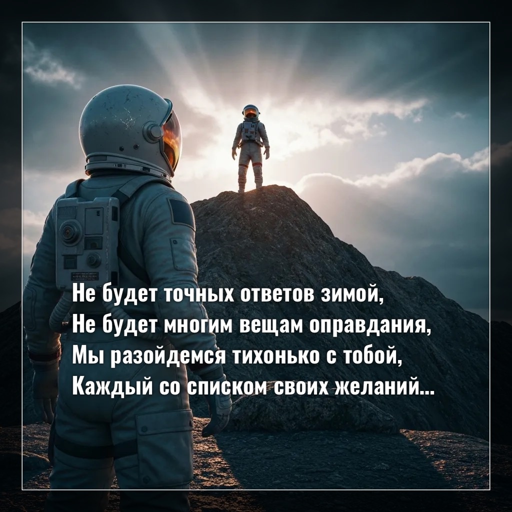 Не будет точных ответов зимой, Не будет многим вещам оправдания, Мы разойдемся тихонько с тобой, Каждый со списком своих желаний, Ты взор на Небо отправишь вновь, Я опущу взгляд свой в траву. Ты попрощаешься со всем, что было, Я буду гнуть правду свою, Так и останутся два одиночества Без общих фраз больше, общих дорог, С тобою вечно что-то случается, Меня всегда бережет здесь Бог, Как бы всему здесь не сопротивлялись, Нас всё равно разведут года, Ты будешь так же смотреть на Небо, А я всё равно буду рядом всегда…