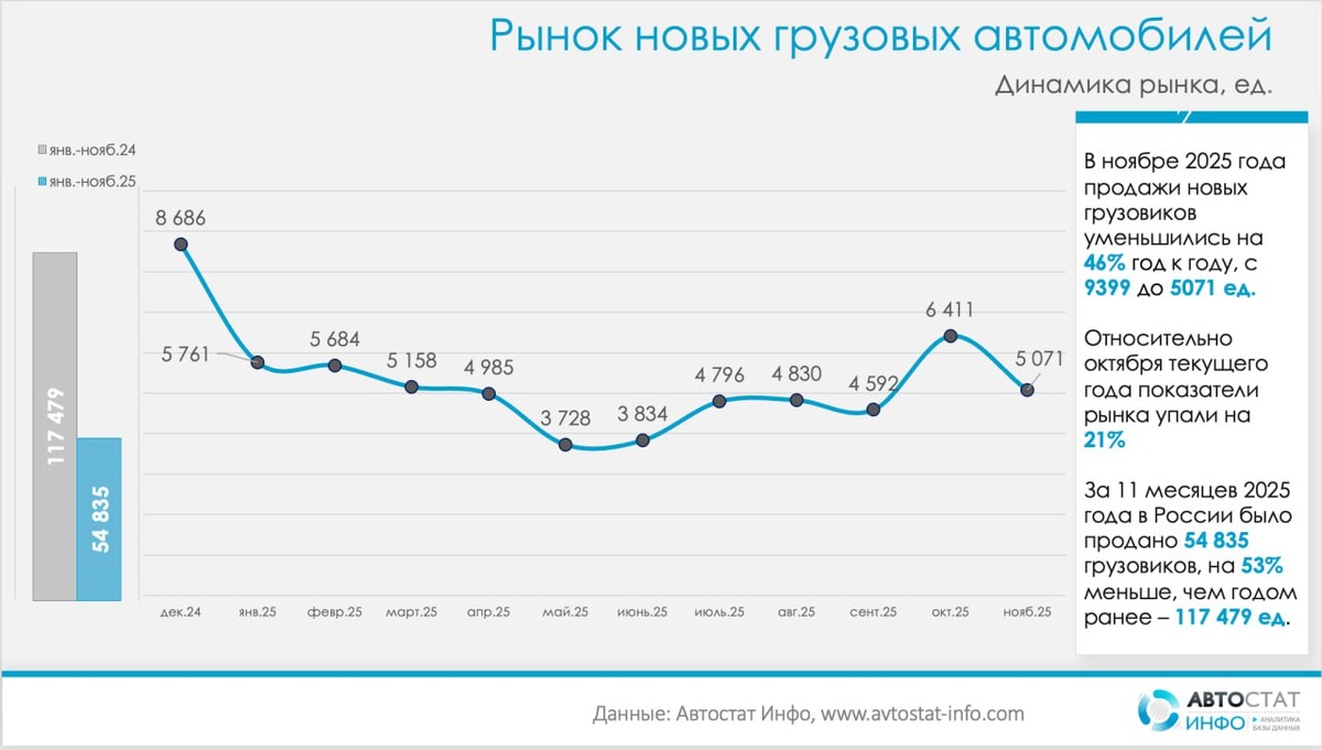 Одиннадцать месяцев падения: рынок новых грузовиков сужается до нескольких моделей По данным «Автостат Инфо», рынок новых грузовых автомобилей к концу 2025 года продолжает сжиматься: в ноябре был продан всего 5 071 грузовик против 9 399 год назад, минус 46% при одновременном падении на 21% относительно октября, когда рынок еще удерживался на уровне 6 411 машин. За январь–ноябрь текущего года реализовано 54 835 новых грузовиков, что на 53% ниже показателя годичной давности (117 479 шт.), и лишь ненамного лучше картины после десяти месяцев 2025 года, когда отставание составляло 54%. Фактически рынок находится на «нижнем плато»: уже второй месяц подряд объемы заметно ниже 6 тыс. машин, тогда как в конце 2024 года продажи превышали 8,5 тыс. грузовиков в месяц. Ноябрь не поддержал октябрьский всплеск спроса, и итог года все очевиднее будет определяться не сезонными колебаниями, а резко сокращенным инвестиционным спросом на обновление парков техники. Структура по брендам подчеркивает масш