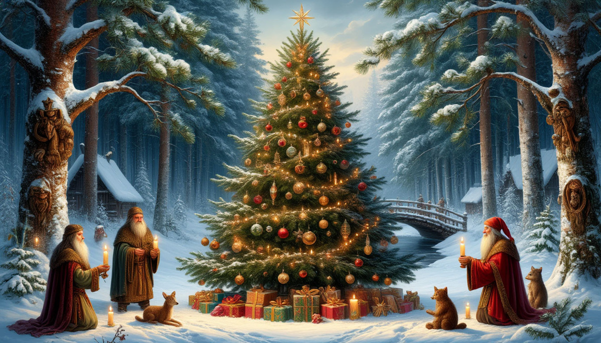 - Викинги: создавали венки из вечнозелёных растений и украшали деревья фигурками богов, надеясь задобрить духов леса.