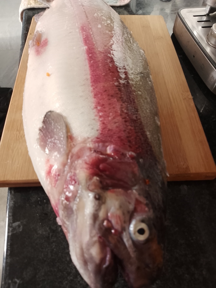 Здравствуйте! Пока я стройкой занимаюсь, жена на рыбалку сходила, не на море или озеро, конечно, но и не в магазин. Есть у нас тут продавцы, заказываешь, привозят. В этот раз вот такая вот форелина. Шесть килограмм. По тысяче двести за один. К новому году подорожала, была дешевле, теперь так. Зато свежая, не перемороженная несколько раз. И подоили. Икрянная. Одной только икры получилось чуть больше чем пол килограмма, свежей, настоящей, красной икры, которую можно посолить так как самому нравится. Будут к новому году бутерброды с красной икрой. Что то расфасовали по баночкам, что то сразу съедим, жена очень любит. Ну а мне заниматься самой рыбой. Жена почистила, моя задача порезать на пласты и собственно засолить. Порезал. Отделять кости не стал, кто то вырезает и хребет и реберные кости, нам нравится так, филе на те же бутерброды, а косточки можно и с пивом после сауны пообсасывать. С солью то же не мудрил, ложка соли, столовая, пол ложки сахара, немного перца молотого