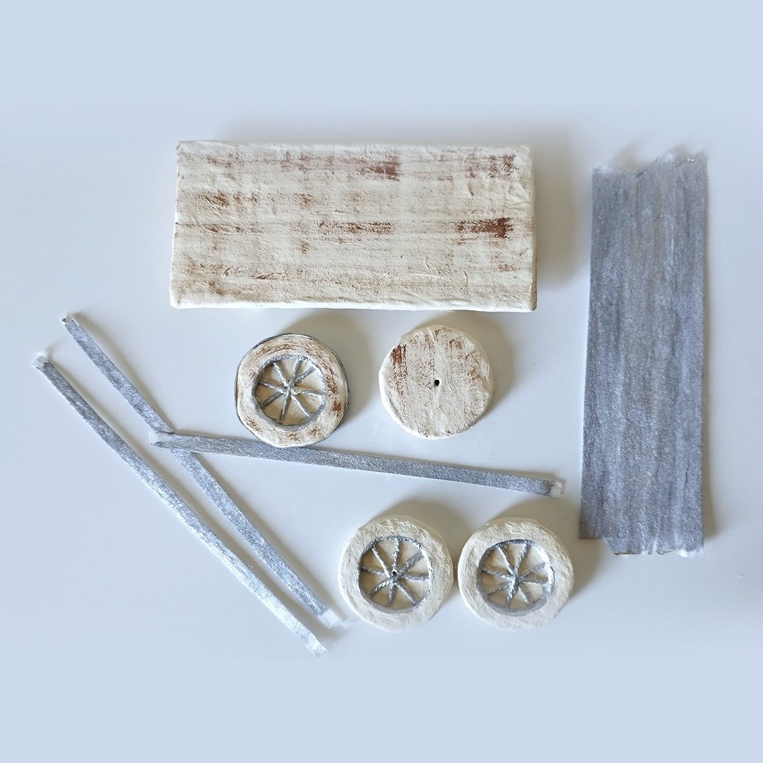 Обклеила весь картон ватой, подсушила и покрасила и за тонировала под дерево. Собрала телегу.
