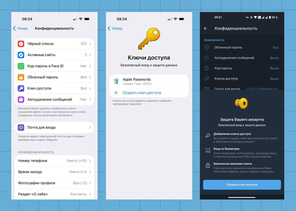 В Telegram появился вход в аккаунт через Face ID или сканер пальца — «ключи доступа» хранятся на устройстве и позволяют обойтись без кодов
