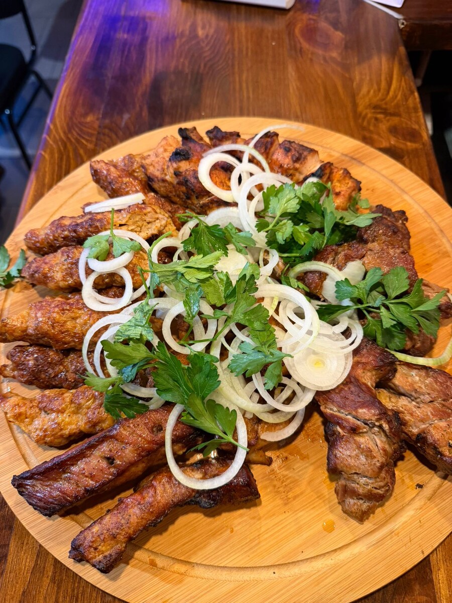 Личный опыт и абсолютная рекомендация того, кто нашел рецепт идеального зимнего вечера. Декабрь. За окном рано темнеет, идет колючий снег, а мысли упрямо возвращаются к теплу, солнцу и аромату костра. В обычный вторник мы с друзьями решили устроить себе маленький побег — не на юг, а всего лишь в кафе. Но этот выбор стал главным решением дня. Наша цель — «Шашлычный дворик», кольцо возле мясокомбината. С первых шагов внутри происходит магия. Тепло, уютный гул голосов и главное — тот самый, ни с чем не сравнимый, дымный аромат жареного мяса. Он действует гипнотически, стирая границы между сезонами. Словно переносишься на майскую дачу, где шашлык — не просто еда, а центр притяжения, ритуал и праздник. Ну красота ведь) И вот он, момент истины. На стол подают шашлык. С первого взгляда видно — он необыкновенный. Румяная, хрустящая корочка, сочащаяся соком при малейшем нажатии. Мясо поражает своей текстурой: нежное, словно тающее, но при этом с характером, с правильной волокнистостью. Вкус