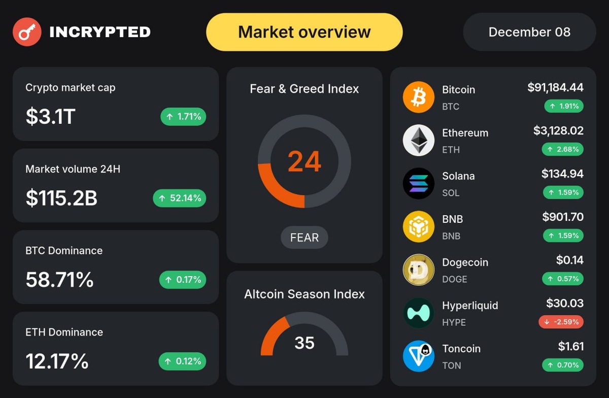 - Капитализация рынка ≈$3.1T (+1.71%)