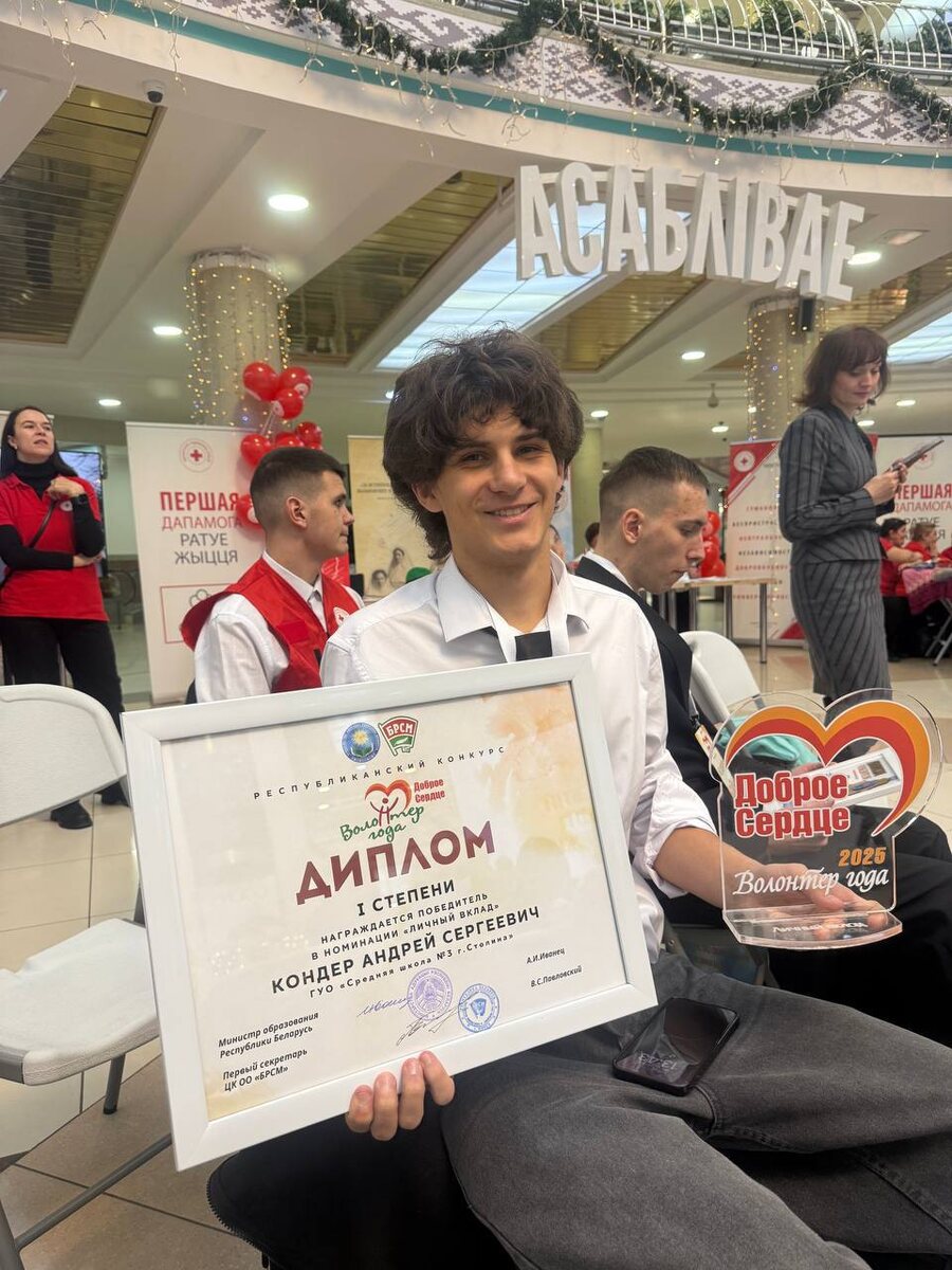 5 декабря в Минске назвали имена лучших! 👑 Стали известны победители Республиканского конкурса «Волонтер года — 2025». Чествовали тех, чьи сердца больше их самих. Тех, кто меняет жизни к лучшему без громких слов, а своими делами. Победителем в номинации «Личный вклад» стал учащийся Средней школы 3 г. Столина Кондер Андрей. 🔵 Поздравляем героев нашего времени! Ваша энергия, доброта и самоотдача — это самый ценный ресурс. Вы вдохновляете!