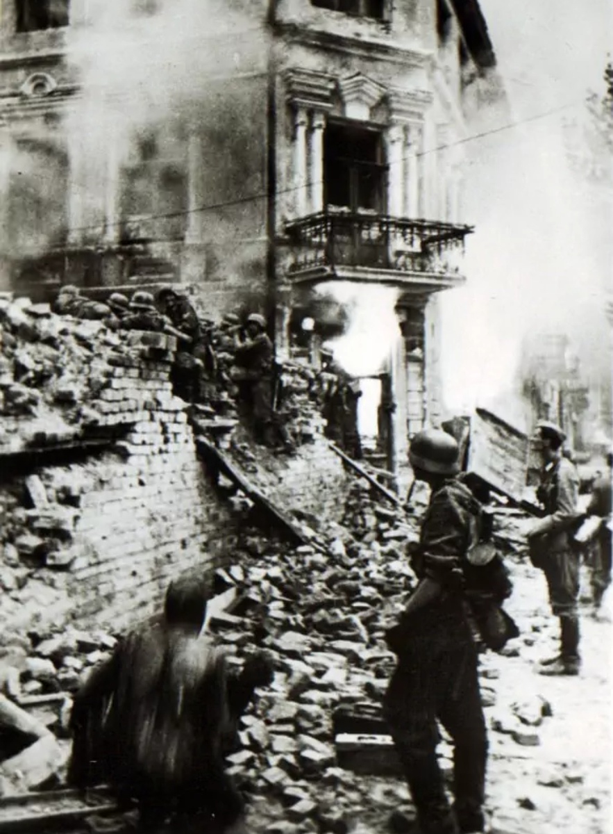 Разрушенные здания справа и слева за спиной женщины с сумкой по ул. Темерницкой до ВОВ выглядели так (вид со стороны Собора).