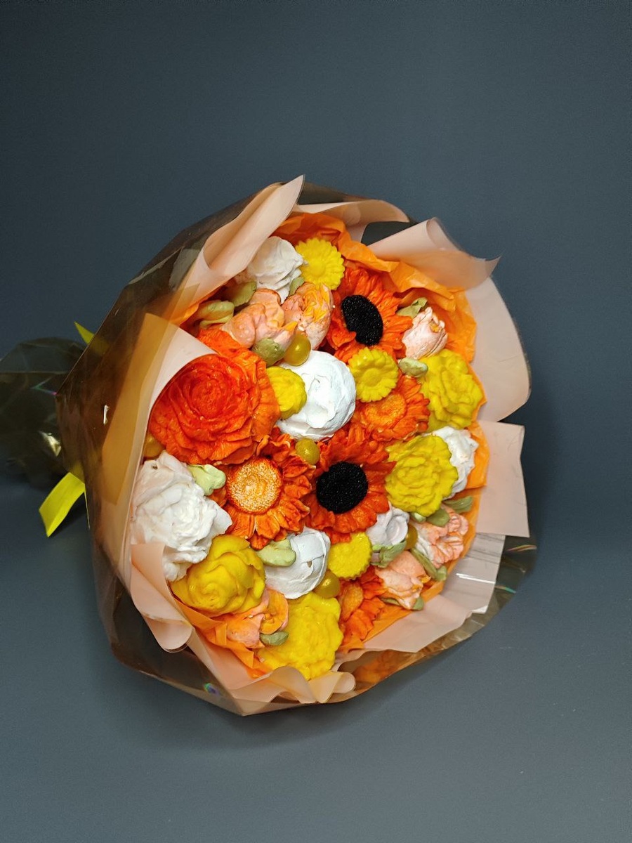 Продолжая многолетнюю добрую традицию дарить подарки в рамках благотворительности, собрала вот такой яркий вкусный букет красивых цветов (розы, подсолнухи, тюльпаны, пионы) из зефира, суфле и маршмеллоу. Благодарю БФ "Добрый Волшебник" за возможность радовать и удивлять подопечных фонда оригинальными съедобными подарками.
