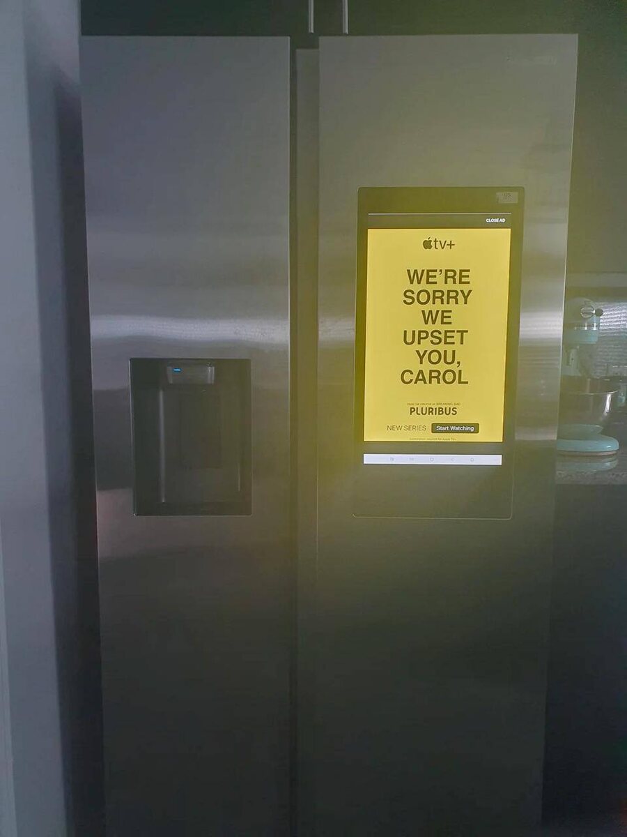 Реклама на холодильнике Samsung довела девушку до острого психоза — об этом рассказал пользователь платформы Reddit. В один из моментов таргетированная реклама холодильника показала промо сериала «Из многих» от Apple и вывела на экран фразу: «НАМ ЖАЛЬ, ЧТО МЫ ТЕБЯ РАССТРОИЛИ, КЭРОЛ» По печальной случайности, сестру автора зовут Кэрол, и она страдает от шизофрении. Надпись на жутком жёлтом фоне показалась девушке зловещей — она подумала, что кто-то пытается связаться с ней через холодильник. У девушки случился первый за 2 года приступ и ей пришлось обратиться в скорую помощь — оттуда её отправили в стационар. Теперь семья пострадавшей пытается узнать, насколько законно показывать такую рекламу на домашнем холодильнике.
