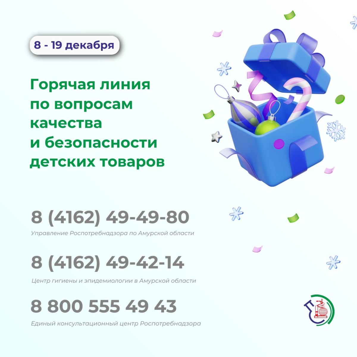☎️С 8 по 19 декабря Роспотребнадзор проведет Всероссийскую горячую линию по вопросам качества и безопасности детских товаров, а также выбору новогодних подарков Традиционная предновогодняя горячая линия стартует во всех регионах России. Специалисты ответят на вопросы, касающиеся качества и безопасности детской одежды, обуви, игрушек, новогодних товаров, детского питания, а также действующих нормативных гигиенических требований к этим категориям товаров Номера телефонов, по которым проводятся консультации в рамках тематической горячей линии: 📍Управление Роспотребнадзора по Амурской области 8(4162)49-49-80 📍Консультационный центр ФБУЗ «Центр гигиены и эпидемиологии в Амурской области» г. Благовещенск, ул. Первомайская, 30 тел. 8(4162)49-42-14, 89145800357 📍Консультационные пункты г. Белогорск, ул. Красноармейская, 15 тел. 8(41641)2-92-15 г. Свободный, ул. Шатковская, 116 тел. 8(41643)3-51-54 (доб. 1527) На федеральном уровне в круглосуточном режиме функционирует Единый консуль