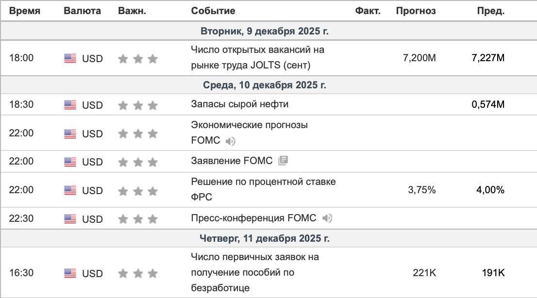 📆 Главные события предстоящей недели 🇺🇸 Понедельник, 8 декабря Нет событий 🇺🇸 Вторник, 9 декабря 🕕 18:00 – JOLTS: количество открытых вакансий Показатель отражает спрос работодателей на рабочую силу. Снижение количества вакансий → охлаждение рынка труда → смягчение ожиданий по ставкам. 🇺🇸 Среда, 10 декабря – главный день недели (решение ФРС) 🕙 22:00 – Экономические прогнозы FOMC / Заявление ФРС / Решение по ставке Ключевой блок недели. Если ставка ниже прогноза или риторика мягче → поддержка risk-on. Более жёсткий тон → укрепление доллара. 🕤 22:30 – Пресс-конференция Пауэлла Главный триггер волатильности. Рынок реагирует на детали: риски по инфляции, ожидания по рынку труда и сигнал о траектории ставок в 2026. 🇺🇸 Четверг, 11 декабря 🕟 16:30 – Первичные заявки на пособия по безработице Рост заявок = охлаждение рынка труда. Снижение – аргумент в пользу более жёсткой позиции ФРС. 🇺🇸 Пятница, 12 декабря Нет событий ⚠️ Фокус недели: Решение ФРС и пресс-конфер