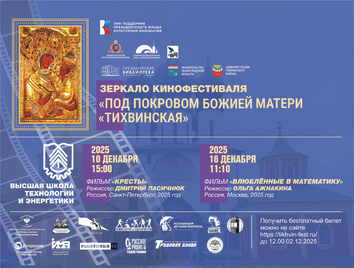 ПОСТПОКАЗЫ «ЗЕРКАЛО КИНОФЕСТИВАЛЯ» по итогам VI Международного Кинофестиваля «Под Покровом Божией Матери Тихвинская» пройдут 10 и 16 декабря 2025 г в Высшей школе Технологии и Энергетики (ВШТЭ) по адресу Санкт-Петербург, ул. Ивана Черных д.4. 10 ДЕКАБРЯ 2025 г. в программе круглого стола «Накануне Великой Отечественной войны: дипломатические уроки и современные интерпретации» состоится показ короткометражного игрового фильма 2025 года «Кресты», Россия, Санкт-Петербург, и творческая встреча с режиссером Дмитрием Пасичнюком. По словам Козлова Сергея Александровича - заведующего кафедрой истории и философии ВШТЭ, д.и.н. в игровом фильме правдиво отражены исторические события, подвиг советского солдата и преемственность поколений. Зрителями станут педагоги и студенты ВШТЭ. 16 ДЕКАБРЯ 2025 г. для студентов направления «Прикладная математика и информатика» состоится постфестивальный показ короткометражного документального фильма 2025 года «Влюбленные в математику», Россия, Москва, режиссё