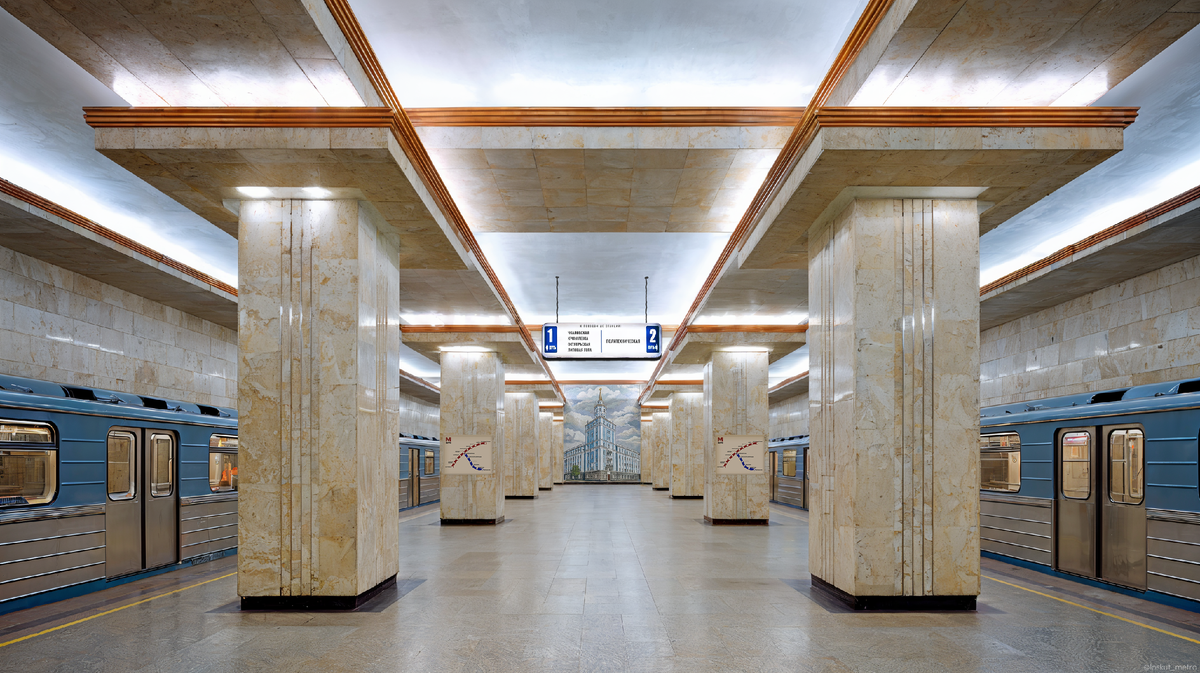В первую очередь передаю привет моим дорогим 170-ми подписчикам. Вы читаете статью из проекта «Пермское метро, если бы его построили в 80-е и продолжили строить в 90-е». Если вы не понимаете, что происходит, то рекомендую прочитать эту статью. Предупреждение: я не строитель и не архитектор. Я просто любитель метро. Все созданные мною изображения являются выдумкой и созданы для того, чтобы вы улыбнулись и помечтали (ну или взгрустнули). «Комсомольская площадь» — вторая станция второй линии виртуального Пермского метро после «Политехнической». Станция мелкого заложения классического колонного типа. Пространство вытянутое и симметричное. Светлый мрамор с тёплыми прожилками задаёт спокойный тон, а массивные прямоугольные колонны формируют чёткий ритм. Потолок многоярусный с утопленными световыми нишами. Свет здесь не бьёт в глаза, он мягко разливается по сводам и отражается от камня. За счёт этого станция кажется выше и просторнее, чем есть на самом деле. На торце стены самая узнаваемая до