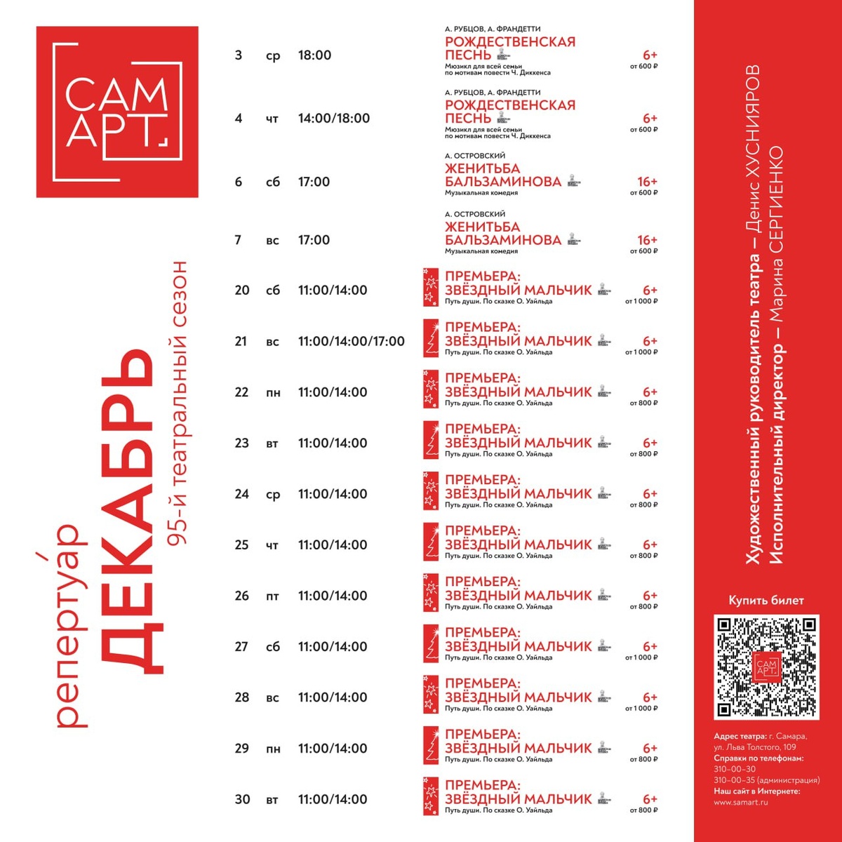 АФИША НА ДЕКАБРЬ, ЯНВАРЬ И ФЕВРАЛЬ Проводим зиму в СамАрте: ⬜️ К Новому году «Звёздный мальчик» (6+) «Рождественская песнь» (6+) ⬜️ Однозначный must-seen «Дом, в котором...» (16+) «Возвращение» (16+) «Воскресение» (16+) ⬜️ «Эскиз-театр» «BLACKBOX» (12+) «Мама, мне оторвало руку» (18+) «Это всё она» (16+) «Черный апельсин» (12+) «За белым кроликом» (16+) ⬜️ Экскурсия по театру «Тайны закулисья: от эскиза до спектакля» (6+) Возможна оплата Пушкинской картой Групповой заказ билетов по телефону +7 (846) 310-00-30 или через чат на сайте SamArt.ru До встречи в СамАрте!