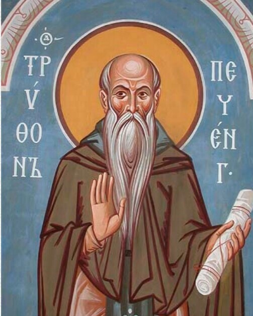 Помню, ранее начало северной зимы в ноябре, метель, снег... Автобус с паломниками прибывает в Печенгу. Тридцать человек чудом умещаются в крохотном бревенчатом храме. Многие исповедуются, причащаются. Прикладываются к иконам Спасителя, Божией Матери, святого Трифона. Преподобный держит в руках свиток, на котором - его предсмертные слова: "Не ослабевайте, братия, упованием на Бога".