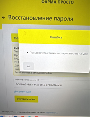 За последние дни мы получили много одинаковых обращений: после обновления электронной подписи пользователи не могут войти в систему Фарма.Просто (МДЛП). При попытке восстановления доступа появляется ошибка: «Пользователь с таким сертификатом не найден» Из-за этого возникает логичный вопрос: сертификат новый, действующий — почему система его “не видит”? Почему возникает эта ошибка В МДЛП и Фарма.Просто пользователь привязан к конкретному сертификату ЭП. Когда вы: перевыпускаете сертификат, меняете носитель, обновляете ЭП, для системы это уже ДРУГОЙ пользователь, даже если ИНН, организация и ФИО те же самые. Поэтому старая учётная запись: остаётся привязанной к старому сертификату; не распознаёт новый и система сообщает: "Пользователь с таким сертификатом не найден". Что с этим делать Нужно выполнить два обязательных шага: 1. Заново добавить новый сертификат в Фарма.Просто. Старый сертификат использовать уже нельзя. 2. Создать (или привязать) новую учётную запись в МДЛП. Ф