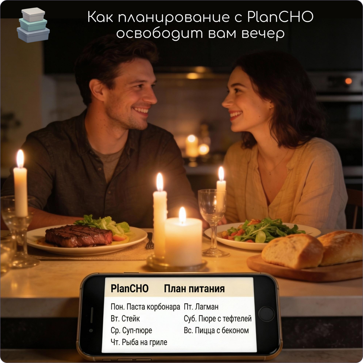 Помните те романтические вечера, которые заканчивались не поцелуями, а фразой «И что сегодня есть?» и совместным утомительным рысканьем по холодильнику? Мы с мужем помним. Наше время для двоих раз за разом пожирала кухонная рутина. Пока мы не осознали простую истину: романтика начинается не тогда, когда зажигаются свечи, а тогда, когда выключается плита. И выключается она ровно в 19:00, потому что ужин уже готов 💑 Всё изменил переход от хаоса к системе. Мы начали использовать PlanCHO не как приложение для хозяйки, а как инструмент для возвращения времени.🤝 Как это работает в нашей паре? В воскресенье вечером — 30 минут на нас двоих.