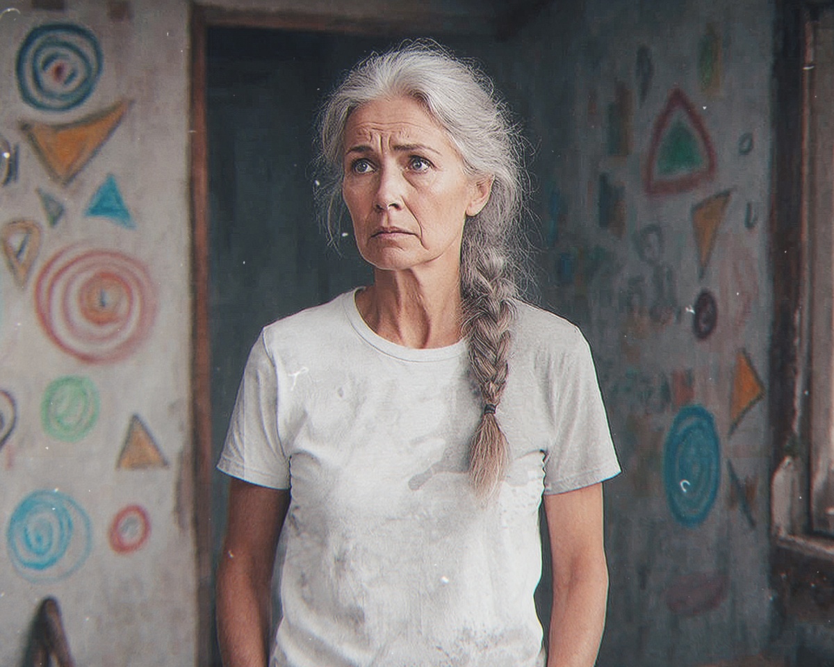 Женщина взяла мелок, лежащий прямо на полу, и принялась обводить спираль, что уже была нарисована на стене.