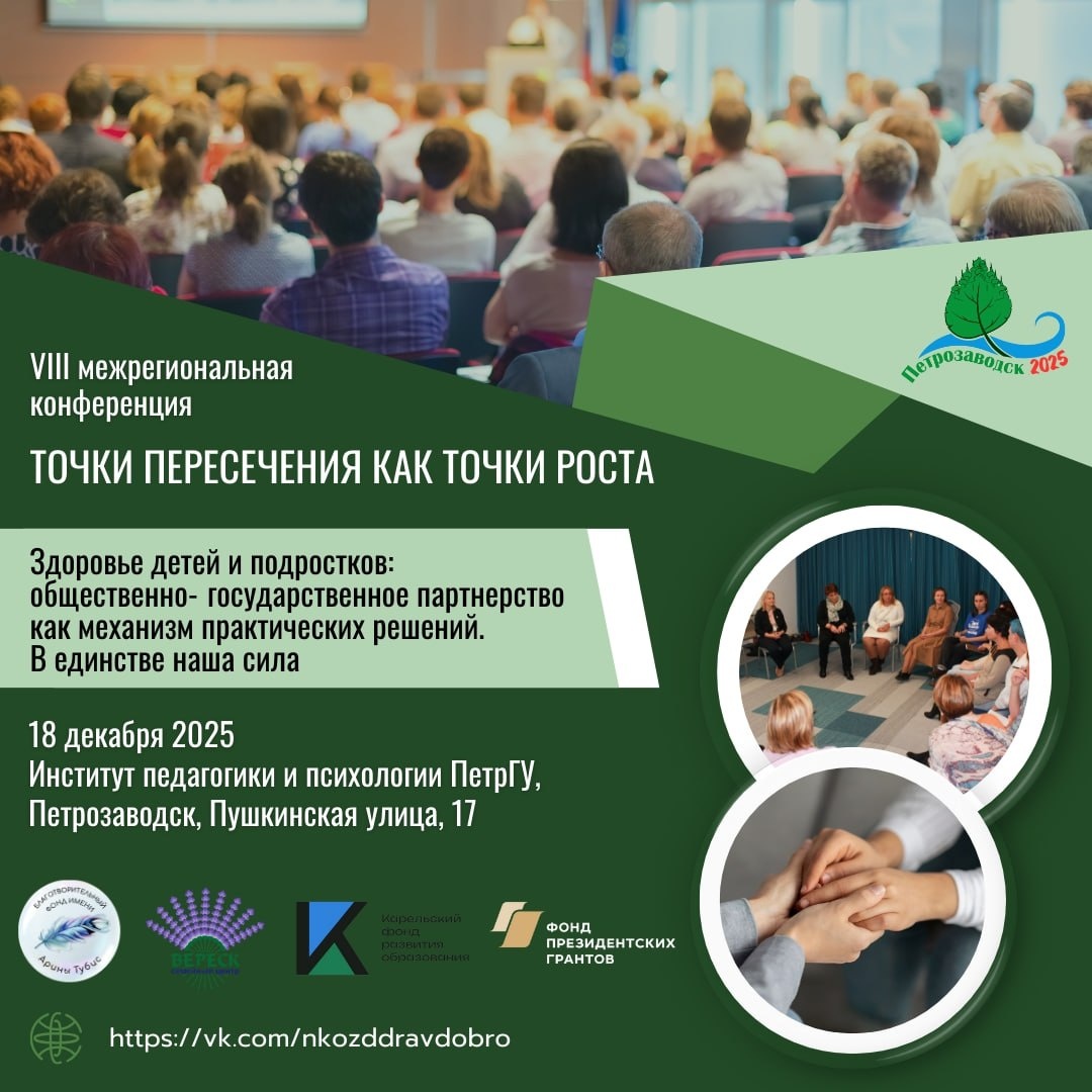 VIII Межрегиональная конференция «Точки пересечения как точки роста» ✔️ Приглашаем представителей Карелии и других регионов на ежегодную конференцию, которая пройдёт 18 декабря 2025 года в Петрозаводске. Тема этого года: «Здоровье детей и подростков: общественно-государственное партнерство как механизм практических решений». В программе — обсуждение ключевых вопросов: • Физическое и психическое здоровье детей, подростков и родителей. • Построение эффективного взаимодействия некоммерческих организаций и государственных структур. • Роль общественных палат как площадок для диалога. • Практические технологии поддержки семьи. К участию приглашаются: · Руководители и специалисты СО НКО, общественных организаций. · Члены Общественной палаты Республики Карелия. · Представители органов государственной и муниципальной власти. · Специалисты учреждений здравоохранения, социальной защиты, образования. · Волонтёры и представители родительской общественности. Конференция проводится с 2017 года