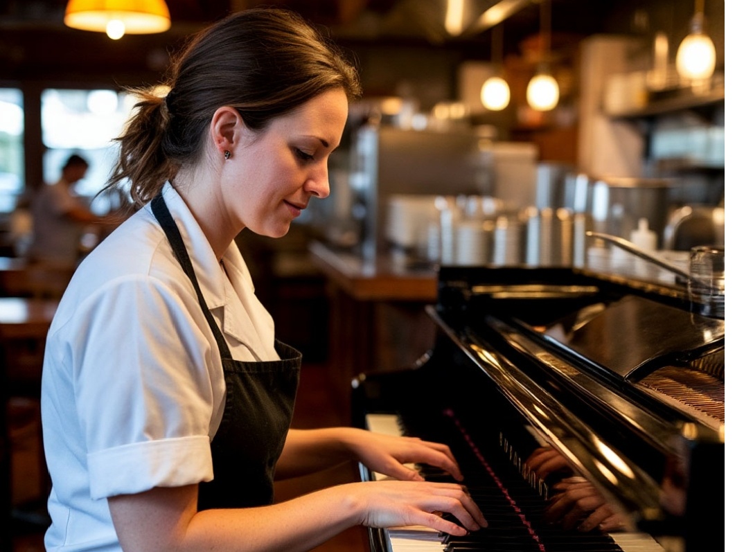 По вечерам, когда ресторан наполнялся гостями, она играла для них легкие пьесы, ненавязчивый фон для ужина.