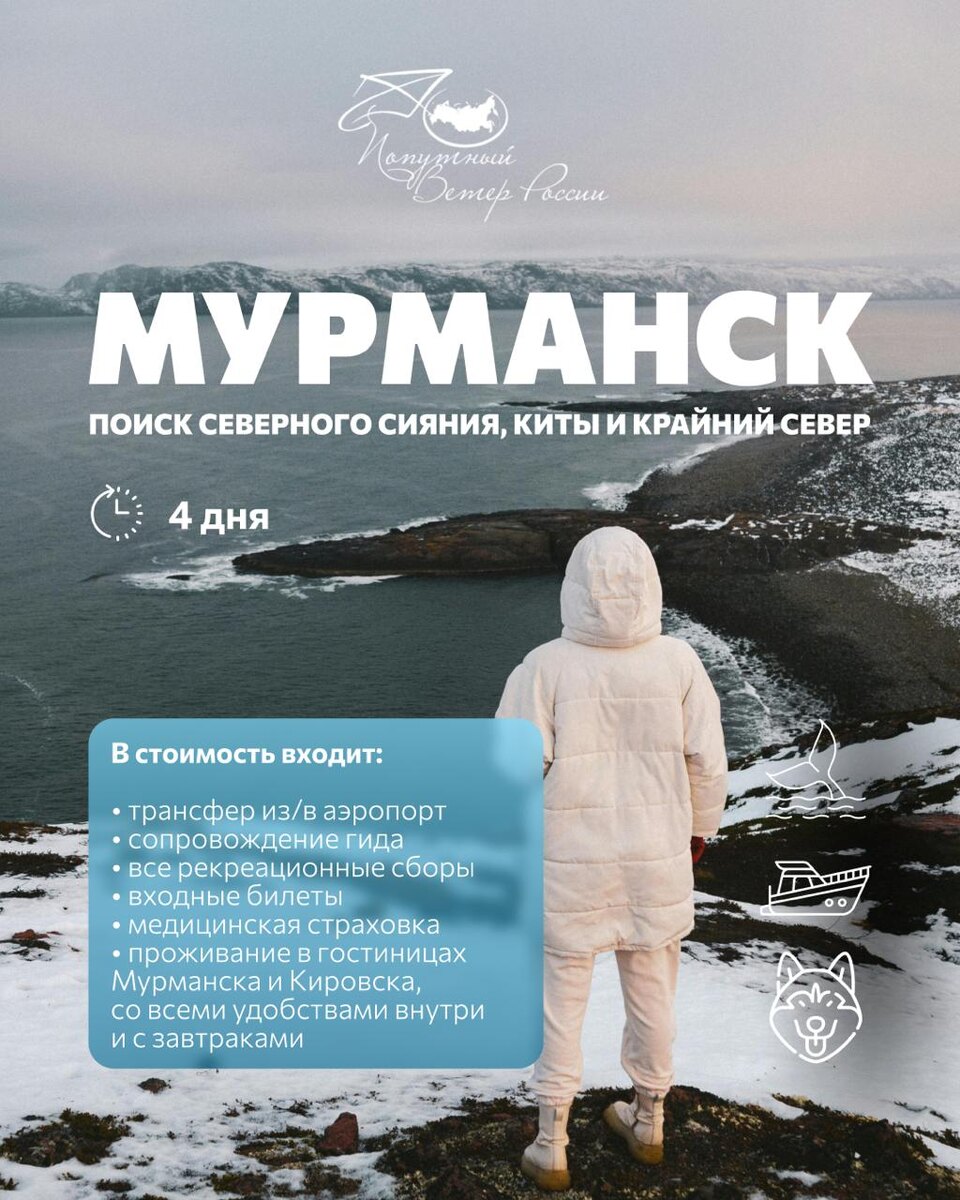 ❄️ Зимний Мурманск — авторское путешествие к Северному сиянию! Мы зовем Вас провести 4 дня за Полярным кругом! Нас ждет: 🌌 Охота за Северным сиянием 🐋 Териберка и Баренцево море 🏔 Хибины и панорамные виды на Кольский полуостров 🦌 Этно-деревня с оленями и хаски Это не просто тур — это концептуальное путешествие, созданное с любовью к Северу ❤️ 💸 Цены от 65 400 ₽ Актуально на момент публикации Скидки для пенсионеров и детей! А еще наши туристы уже активно бронируют поездку на январь 2026, подсказать свободные даты? 😍 📩 Пишите в личные сообщения — расскажем детали @wildtail_tour