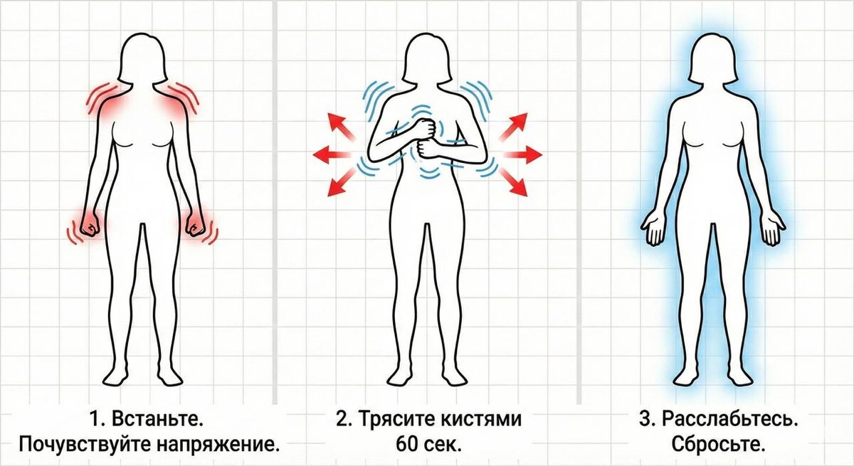 ...Кому надоело носить войну в себе — жду завтра. А чтобы вы не ждали до завтра — сделайте это прямо сейчас. Да, пока читаете этот текст. Встаньте (или хотя бы сядьте ровно). Поднимите руки и начните трясти кистями. Мелко, быстро, жестко. Представьте, что к пальцам прилипла какая-то гадость. Или что вы стряхиваете с себя усталость, как воду. Продолжайте 60 секунд. Не останавливайтесь, даже если глупо выглядит. Чувствуете покалывание в пальцах? Тепло в плечах? Поздравляю. Вы только что обманули свой мозг и сказали ему: «Опасность позади». Завтра научу делать это всем телом.
