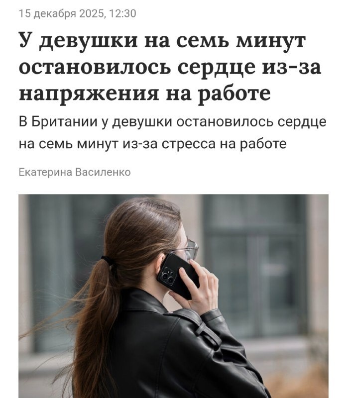 Раота довела британку до клинической смерти. Ее сердце остановилось из-за стресса. Женщина постоянно испытывала огромное количество задач на работе и переживала по разным поводам. В итоге это привело к тому, что ее сердце остановилось на 7 минут. Благо прибывшие медики успели спасти ее. Девушка вела здоровый образ жизни и занималась спортом. Однако даже это не уберегло ее. Наслоившийся стресс выявил редкую сердечную аномалию. Это случилось, хотя она была активной и заотилась о своем здоровье. @pricealert